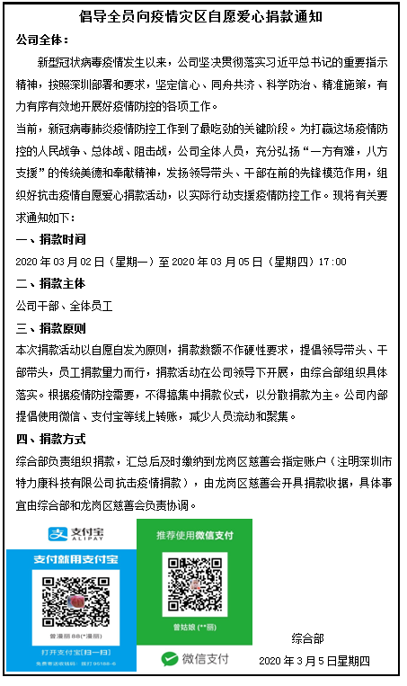 在公司層領(lǐng)導(dǎo)的帶領(lǐng)下,特力康人員紛紛解囊,小到幾十上百,大到數(shù)千,錢不分多寡,截止3月6日,結(jié)合特力康公積金捐助,共計(jì)捐款十萬元整。這都是特力康人在力所能及范圍內(nèi)對(duì)抗擊疫情的默默支持,是對(duì)有困難群眾的守望相助。充分發(fā)揚(yáng)團(tuán)結(jié)互助精神,攜手并肩,眾志成城,凝聚起抗擊疫情的堅(jiān)定信心和強(qiáng)大力量,用另一種方式陪伴一線抗疫醫(yī)務(wù)人員和疫情患者一起戰(zhàn)勝病魔。