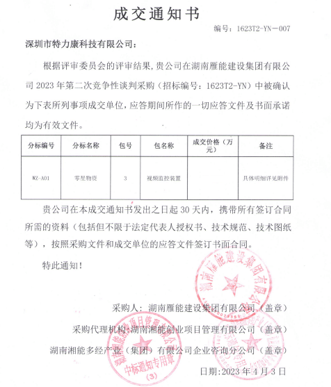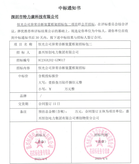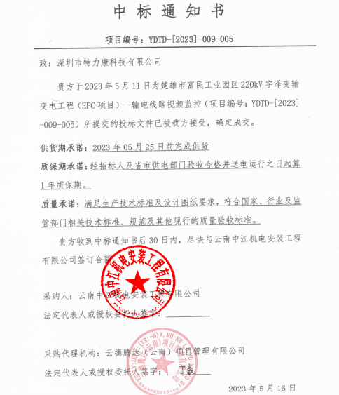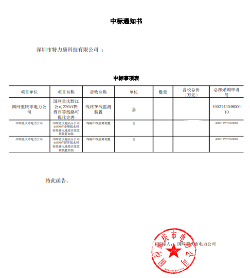 特力康中標國網(wǎng)黑龍江送變電工程公司的2024年度第18次物資類競爭性談判采購項目——慶陽驅鳥器物資框 特力康中標國網(wǎng)甘肅省電力公司省管產(chǎn)業(yè)單位2024年第五次物資競爭性談判授權采購項目 中標喜訊:深圳市特力康科技有限公司成功入圍許繼集團綜合能源公司輸電線路視頻在線監(jiān)測裝置模塊集采項目 中標喜訊:特力康成功中標國網(wǎng)重慶市電力公司渝中一片區(qū)項目 特力康成功中標國網(wǎng)天津市電力公司2024年第二次?物?資招標項目 特力康中標國網(wǎng)安徽省電力有限公司蕪湖供電公司2024年3月非物質采購項目 電力安全新保障:深圳特力康測斜裝置助力安徽電力公司高效運維 四川電力公司應用防山火紅外熱成像雙目攝像機,及時發(fā)現(xiàn)潛在的山火隱患 江西電力公司應用輸電線路等值覆冰在線監(jiān)測,降低冰災停電風險和經(jīng)濟損失 四川電力公司攜手深圳特力康:輸電防山火智慧監(jiān)控裝置成功上線運行 創(chuàng)新視角:深圳特力康線路氣象災害監(jiān)測預警系統(tǒng)如何重塑浙江電力公司的線路防災策略 河南電力公司應用深圳特力康輸電線路桿塔傾斜在線監(jiān)測裝置,提高電網(wǎng)的安全性和穩(wěn)定性 寧夏配電線路安裝了我司防外破電子化智能警示牌