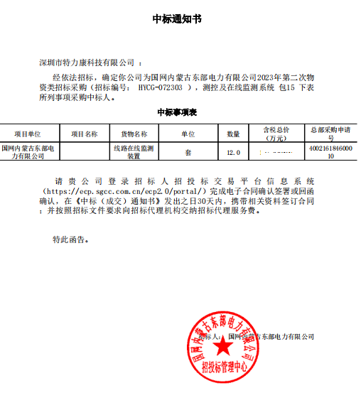 經(jīng)依法招標(biāo),確定我司為國網(wǎng)內(nèi)蒙古東部電力有限公司2023年第二次物資類招標(biāo)采購(招標(biāo)編號: HYCG -072303 ),測控及在線監(jiān)測系統(tǒng)包15下表所列事項采購中標(biāo)人。中標(biāo)通知如下: