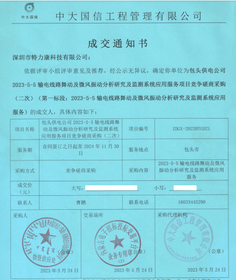 依據(jù)評(píng)審小組評(píng)審意見(jiàn)及推薦,經(jīng)公示無(wú)異議,確定我司為包頭供電公司2023-5-5輸電線路舞動(dòng)及微風(fēng)振動(dòng)分析研究及監(jiān)測(cè)系統(tǒng)應(yīng)用服務(wù)項(xiàng)目競(jìng)爭(zhēng)磋商采購(gòu)(二次) (第一標(biāo)段: 2023-5-5 輸電線路舞動(dòng)及微風(fēng)振動(dòng)分析研究及監(jiān)測(cè)系統(tǒng)應(yīng)用服務(wù))的成交人,具體內(nèi)容如下: