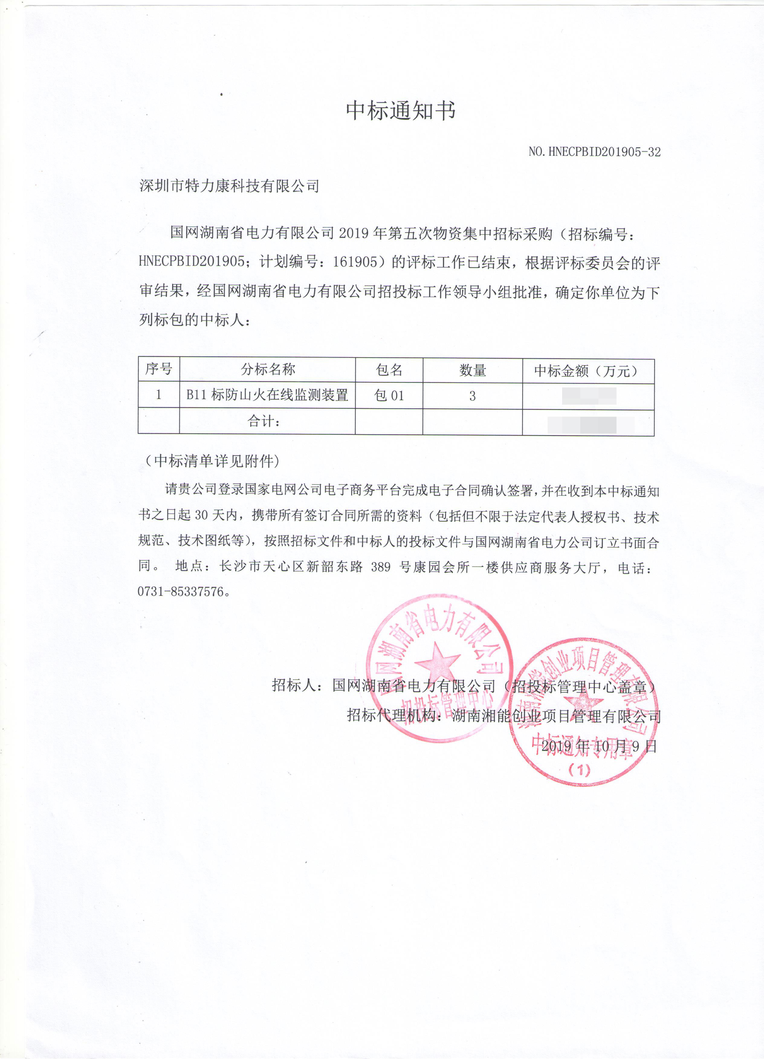 國網(wǎng)湖南省電力有限公司2019年第五次物資集中招標輸電線路防山火監(jiān)測裝置的評標工作已結束,根據(jù)評標審結果,經(jīng)國網(wǎng)湖南省電力有限公司招投標工作領導小組批準,確定我司深圳市特力康科技有限公司為列標包的中標人。