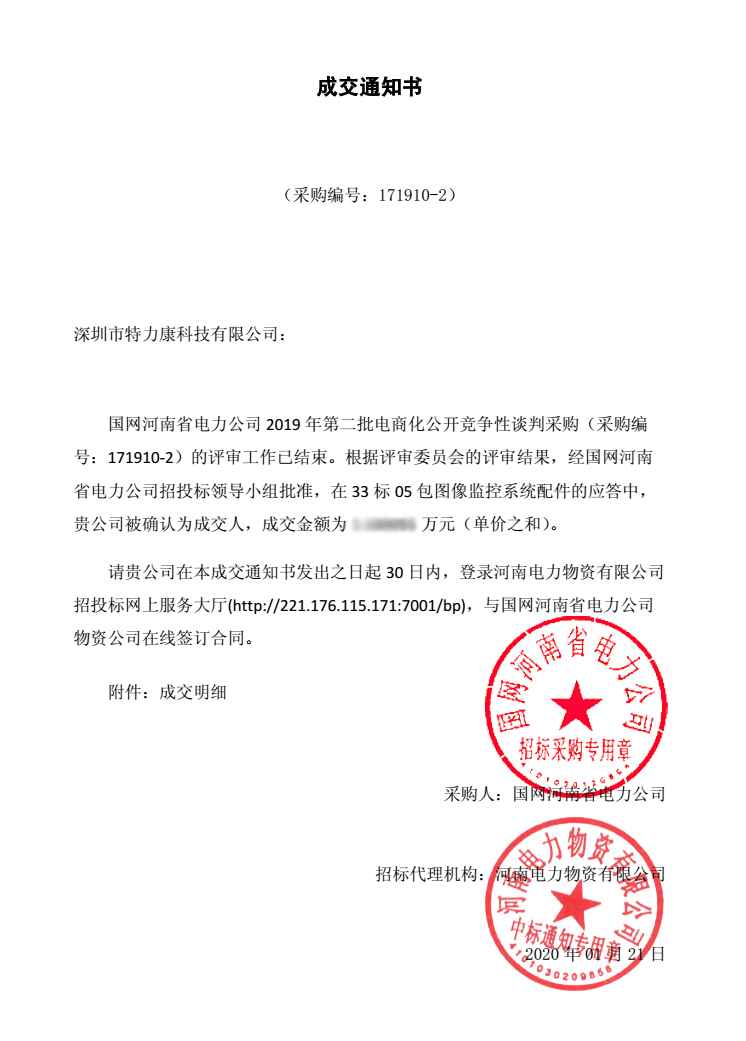 國網(wǎng)河南省電力公司2019年第二批電商化公開競爭性談判采購(采購編號: 171910-2) 談判工作已結(jié)束,經(jīng)評審委員會評審,并報公司招投標(biāo)工作領(lǐng)導(dǎo)小組批準,我司中標(biāo)國網(wǎng)河南省電力公司2019年第二批電商化公開競爭性談判采購33標(biāo)05包圖像監(jiān)控系統(tǒng)配件及34標(biāo)03包圖像監(jiān)控系統(tǒng)接口板,中標(biāo)通知如下: