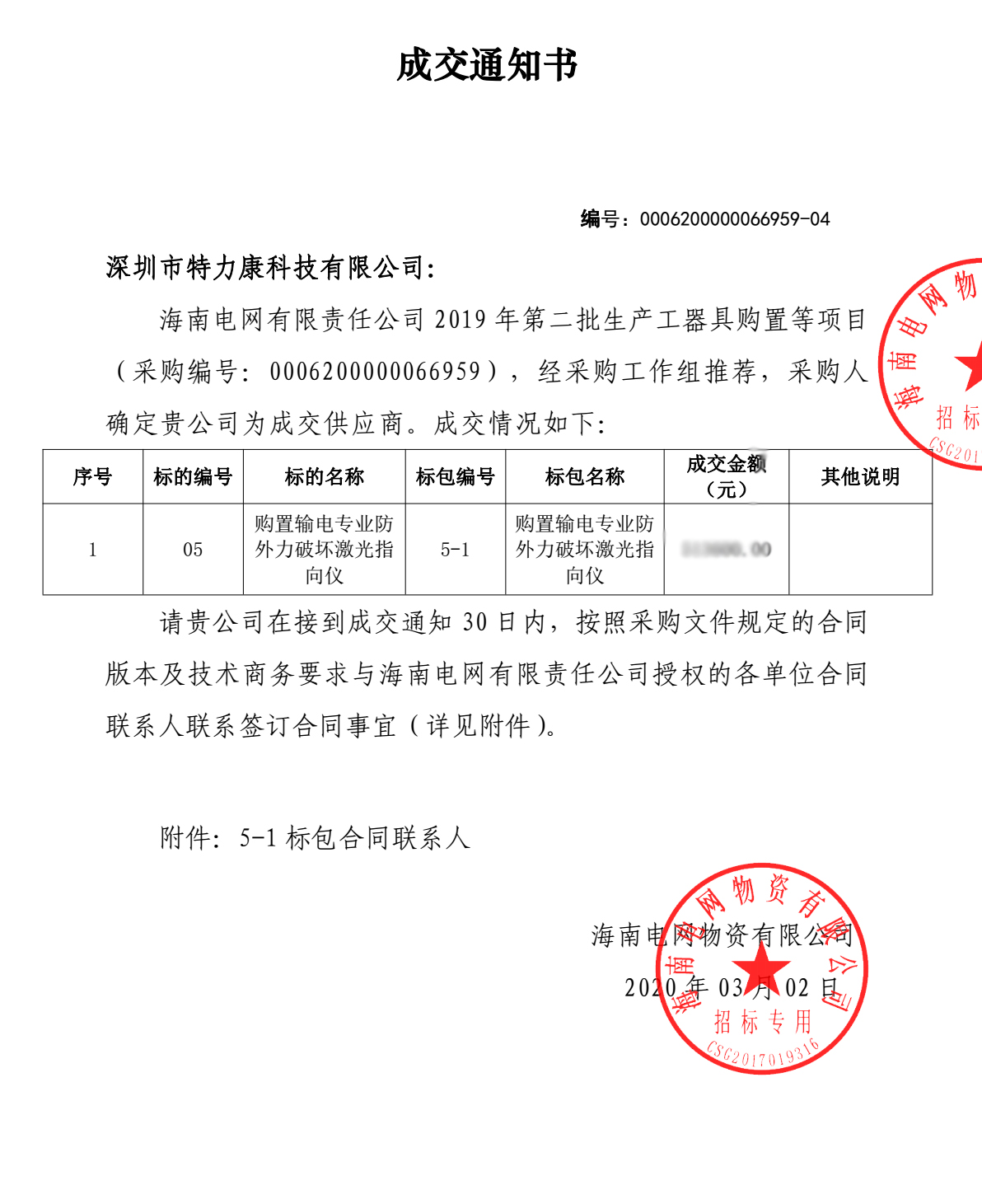 海南電網(wǎng)有限責(zé)任公司2019年第二批生產(chǎn)工器具購等項(xiàng)目(采購編號; 0000660509 )采購工作已完成。經(jīng)采購工作組推薦,采購人確定我司(深圳市特力康科技有限公司)成為本此標(biāo)包5-1購置輸電專業(yè)防外力破壞激光指向儀及標(biāo)包10-1購置防山火監(jiān)控裝置的成交供應(yīng)商,附成交通知書如下: