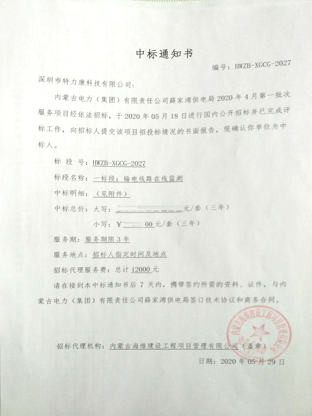 內(nèi)蒙古電力(集團)有限責任公司薛家灣供電局2020年4月第一批次服務項目(一標段:輸電線路在線監(jiān)測)經(jīng)依法招標,于2020年05月18日進行國內(nèi)公開招標并已完成評標工作,向招標人提交該項目招投標情況的書面報告,現(xiàn)確認我司(深圳市特力康科技有限公司)為中標人。特發(fā)中標通知書,如下: