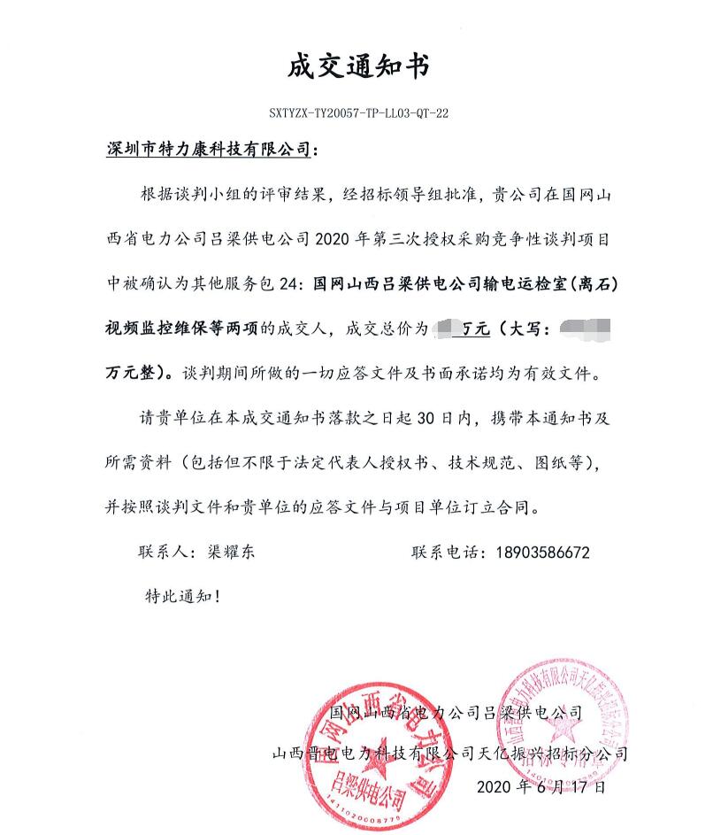 根據(jù)談判小組的評審結(jié)果,經(jīng)招標(biāo)領(lǐng)導(dǎo)組批準(zhǔn),我司(深圳市特力康科技有限公司)在國網(wǎng)山西省電力公司呂梁供電公司2020年第三次授權(quán)采購競爭性談判項(xiàng)目中被確認(rèn)為其他服務(wù)包24:國網(wǎng)山西呂梁供電公司輸電運(yùn)檢室(離石)視頻監(jiān)控維保等兩項(xiàng)的成交人,現(xiàn)中標(biāo)通知以下: