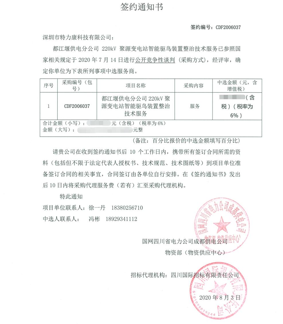2020年7月14日我司(深圳市特力康科技有限公司)參加的都江堰供電分公司220kV聚源變電站智能驅(qū)鳥裝置整治技術(shù)服務(wù),已參照國家相關(guān)規(guī)定進行公開競爭性談判(采購方式),后經(jīng)專家評審,確定我司為都江堰供電分公司220kV聚源變電站智能驅(qū)鳥裝置整治技術(shù)服務(wù)中選服務(wù)商。特發(fā)簽約通知書如下: