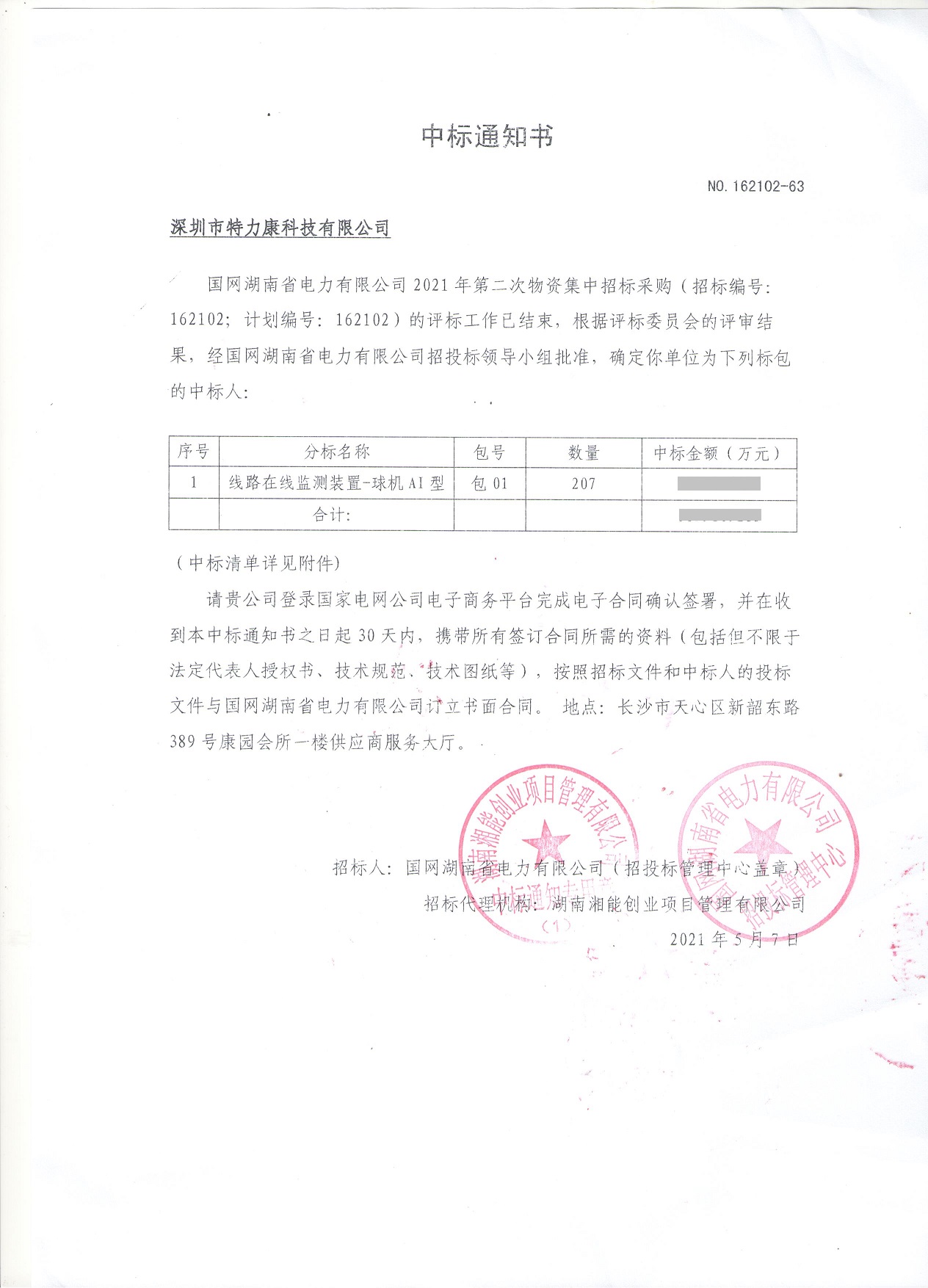 國網(wǎng)湖南省電力有限公司2021年第二次物資集中招標(biāo)采購(招標(biāo)編號:162102;計(jì)劃編號: 162102) 的評標(biāo)工作已結(jié)束,根據(jù)評標(biāo)委員會的評審結(jié)果,經(jīng)國網(wǎng)湖南省電力有限公司招投標(biāo)領(lǐng)導(dǎo)小組批準(zhǔn),確定我司為線路在線監(jiān)測裝置-球機(jī)AI型標(biāo)包的中標(biāo)人,中標(biāo)通知如下:
