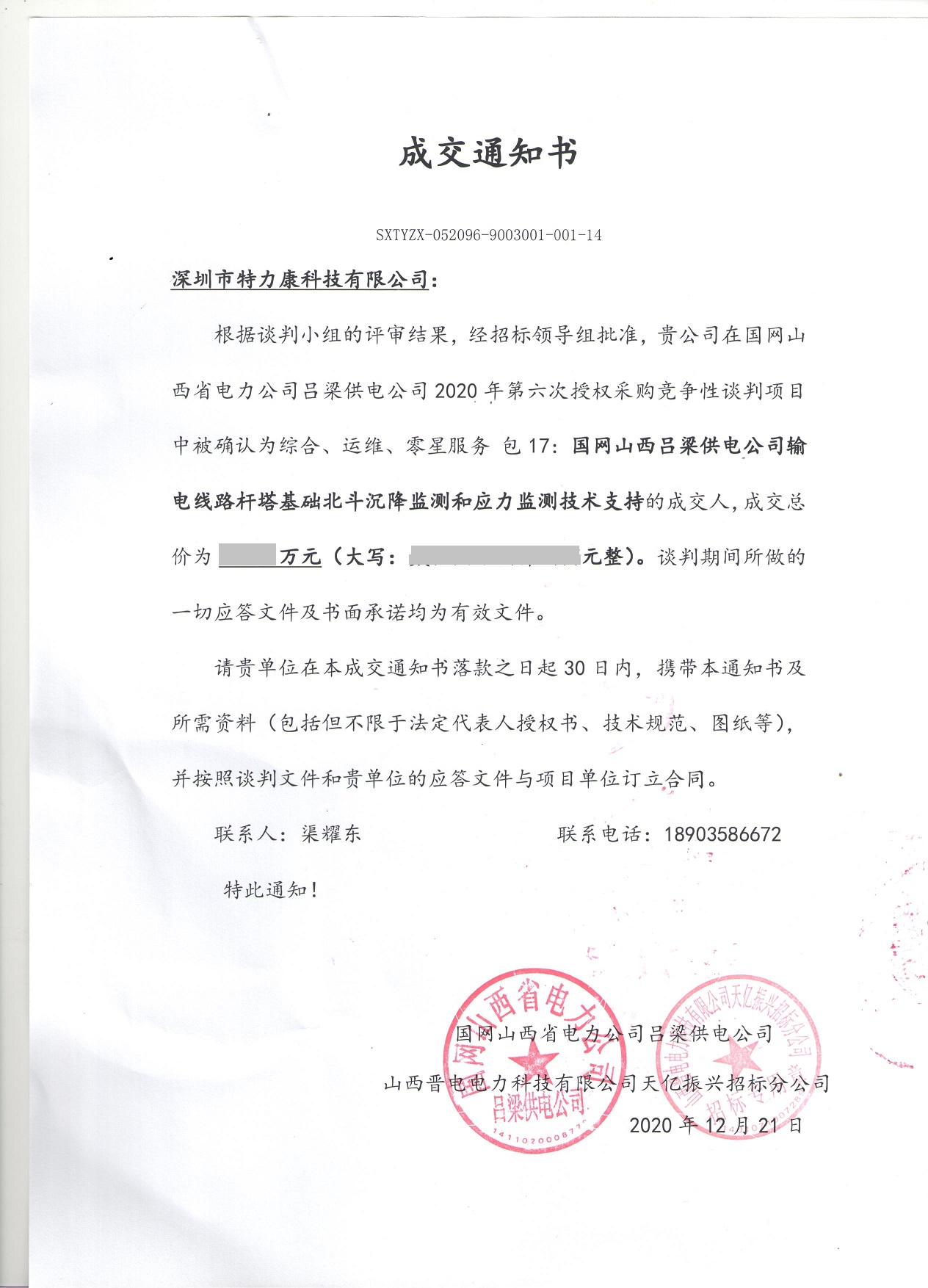 根據(jù)談判小組的評(píng)審結(jié)果,經(jīng)招標(biāo)領(lǐng)導(dǎo)組批準(zhǔn),貴公司在國(guó)網(wǎng)山西省電力公司呂梁供電公司2020年第六次授權(quán)采購(gòu)競(jìng)爭(zhēng)性談判項(xiàng)目中被確認(rèn)為綜合、運(yùn)維、零星服務(wù)包17:國(guó)網(wǎng)山西呂梁供電公司輸電線路桿塔基礎(chǔ)北斗沉降監(jiān)測(cè)和應(yīng)力監(jiān)測(cè)技術(shù)支持的成交人,成交通知如下: