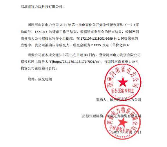 國網(wǎng)河南省電力公司2021年第一批電商化公開競爭性談判采購《- -) (果購編號: 172107) 的評審工作已結束。根據(jù)評審委員合的評審結果,經(jīng)國網(wǎng)河南省電力公司招投標領導小組批準,在7210710101.9999標1包攝像機的應答中,責公司被確認為成交人,中標通知如下: