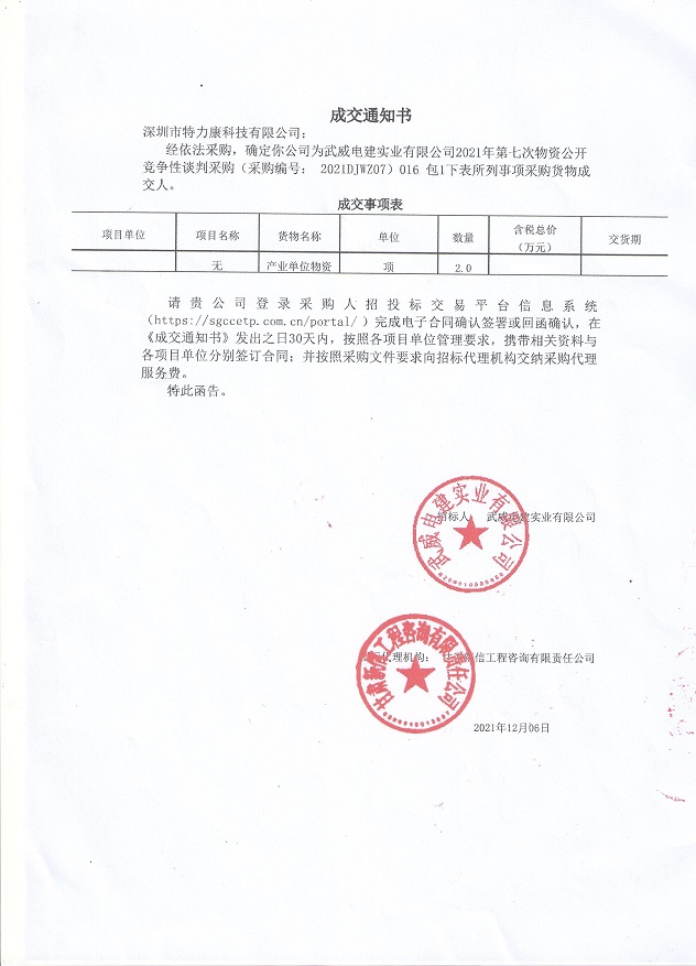 經(jīng)依法采購,確定我司為武威電建實(shí)業(yè)有限公司2021年第七次物資公開競爭性談判采購(采購編號: 2021DJWZ07) 016包I下表所列事項(xiàng)采購貨物成交人。成交通知如下: