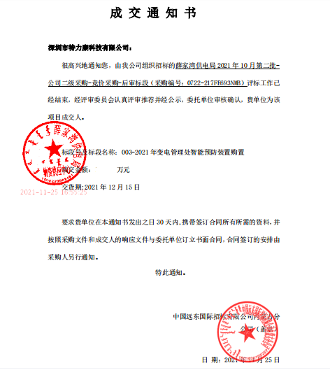 特力康中標(biāo)國網(wǎng)黑龍江送變電工程公司的2024年度第18次物資類競爭性談判采購項目——慶陽驅(qū)鳥器物資框 特力康中標(biāo)國網(wǎng)甘肅省電力公司省管產(chǎn)業(yè)單位2024年第五次物資競爭性談判授權(quán)采購項目 中標(biāo)喜訊:深圳市特力康科技有限公司成功入圍許繼集團(tuán)綜合能源公司輸電線路視頻在線監(jiān)測裝置模塊集采項目 中標(biāo)喜訊:特力康成功中標(biāo)國網(wǎng)重慶市電力公司渝中一片區(qū)項目 特力康成功中標(biāo)國網(wǎng)天津市電力公司2024年第二次?物?資招標(biāo)項目 特力康中標(biāo)國網(wǎng)安徽省電力有限公司蕪湖供電公司2024年3月非物質(zhì)采購項目 電力安全新保障:深圳特力康測斜裝置助力安徽電力公司高效運維 四川電力公司應(yīng)用防山火紅外熱成像雙目攝像機(jī),及時發(fā)現(xiàn)潛在的山火隱患 江西電力公司應(yīng)用輸電線路等值覆冰在線監(jiān)測,降低冰災(zāi)停電風(fēng)險和經(jīng)濟(jì)損失 四川電力公司攜手深圳特力康:輸電防山火智慧監(jiān)控裝置成功上線運行 創(chuàng)新視角:深圳特力康線路氣象災(zāi)害監(jiān)測預(yù)警系統(tǒng)如何重塑浙江電力公司的線路防災(zāi)策略 河南電力公司應(yīng)用深圳特力康輸電線路桿塔傾斜在線監(jiān)測裝置,提高電網(wǎng)的安全性和穩(wěn)定性 寧夏配電線路安裝了我司防外破電子化智能警示牌