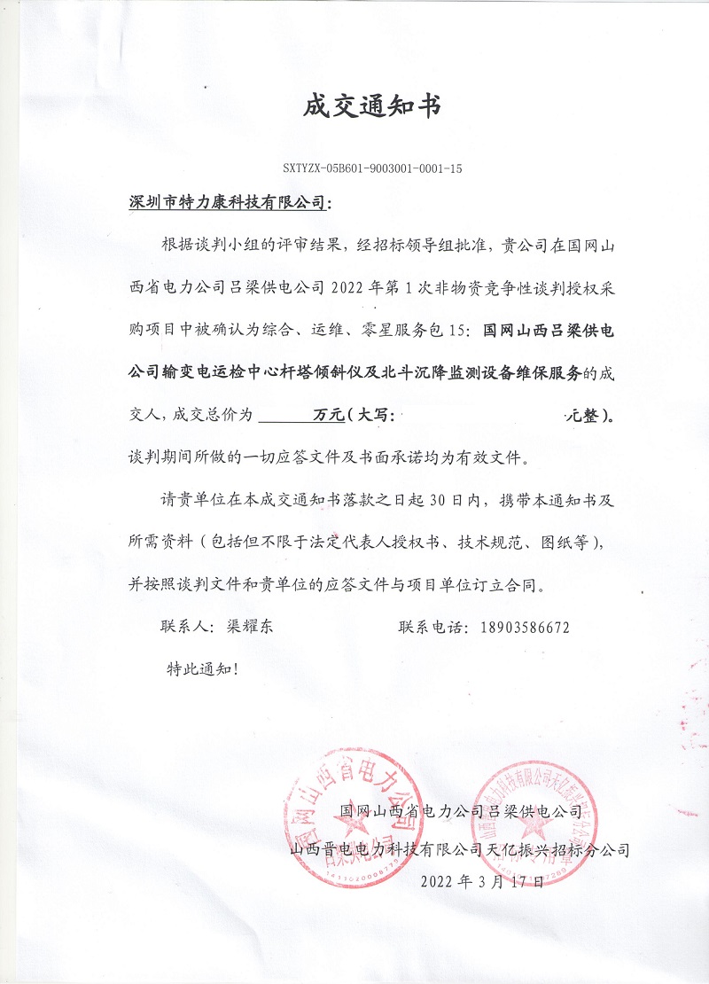 根據(jù)談判小組的評審結(jié)果,經(jīng)招標領(lǐng)導組批準,我司在國網(wǎng)山西省電力公司呂梁供電公司2022年第1次非物資競爭性談判授權(quán)采購項目中被確認為綜合、運維、零星服務包15:國網(wǎng)山西呂梁供電公司輸變電運檢中心桿塔傾斜儀及北斗沉降監(jiān)測設(shè)備維保服務的成交人,成交通知如下: