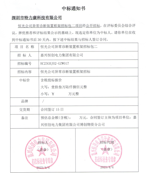 恒光公司異常診斷裝置框架招標包二項目經公開招標,在評標委員會綜合評議,擇優(yōu)推薦和評標結果公示的基礎上,現(xiàn)選定我司為中標人,中標通知如下:
