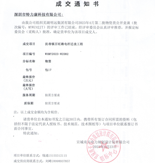 由我公司組織蕪湖明遠(yuǎn)集團(tuán)有限公司2023年4月第二批物資類公開競(jìng)談(批次編號(hào): MYWZ42JT) 的評(píng)審工作已結(jié)束,經(jīng)評(píng)審委員會(huì)認(rèn)真評(píng)審?fù)扑],并報(bào)定標(biāo)委員公(采購(gòu)人)批準(zhǔn),確定貴單位為該項(xiàng)目成交人。成交通知如下:
